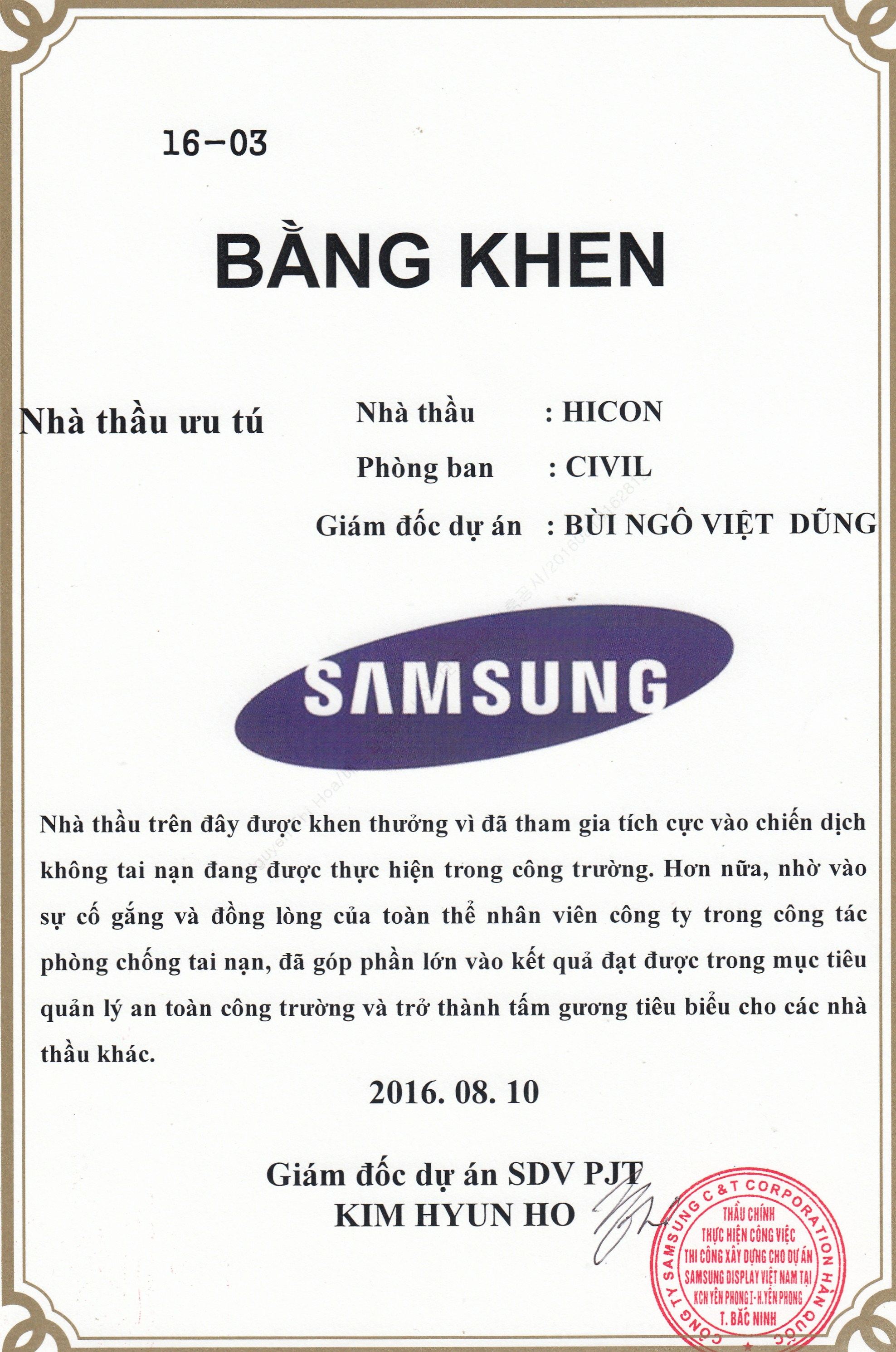 HICON company was honored to receive a certificate of merit from the Samsung contractor for...